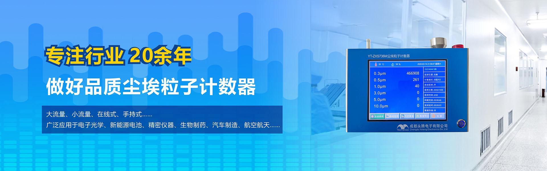 成都永騰電子有限公司位于成都市國家經(jīng)濟技術(shù)開發(fā)區(qū),是一家專業(yè)從事環(huán)境空氣監(jiān)測儀器研發(fā)、生產(chǎn)、銷售于一體的高科技企業(yè)。產(chǎn)品涵蓋空氣檢測儀器、潔凈間在線塵埃粒子計數(shù)器監(jiān)測系統(tǒng)、大氣顆粒物監(jiān)測微站系統(tǒng)、電化學分析儀器、實驗室設(shè)備等產(chǎn)品。